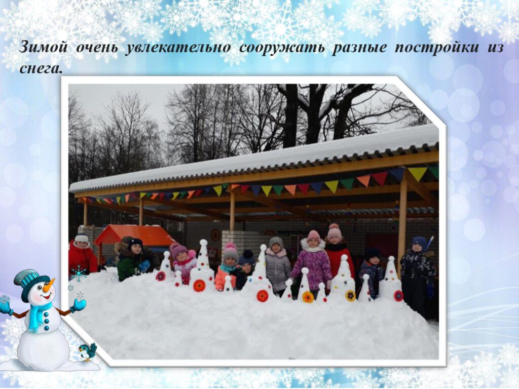 Для каждого из нас зима — долгожданное и любимое время года. В этом году зима побаловала нас обильными снежными осадками. Чтобы детям было интересно проводить время, гуляя на участке детского сада, мы решили сделать постройки из снега. Постепенно на участке стали появляться постройки. Сначала появилась крепость, затем перед ней башня с часами, а рядом сказочный замок. У входа на участок встречает символ года Петух. Ребята могут отправиться в плавание на чудесном корабле в поисках сокровищ. В оформлении участка большую помощь оказали наши отзывчивые родители, они подносили воду, снег; принимали участие в постройках, с удовольствием осваивали новые технологии работы со снегом. И для жизнерадостных детей наш участок превратился в снежную страну. Ведь снежные постройки позволяют разнообразить прогулки с детьми. Ребята любят прогулки и с радостью играют в веселые зимние игры на нашем снежном участке. Вот какие постройки мы смастерили.