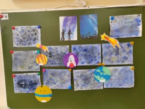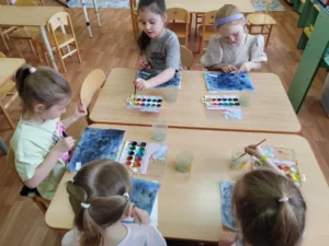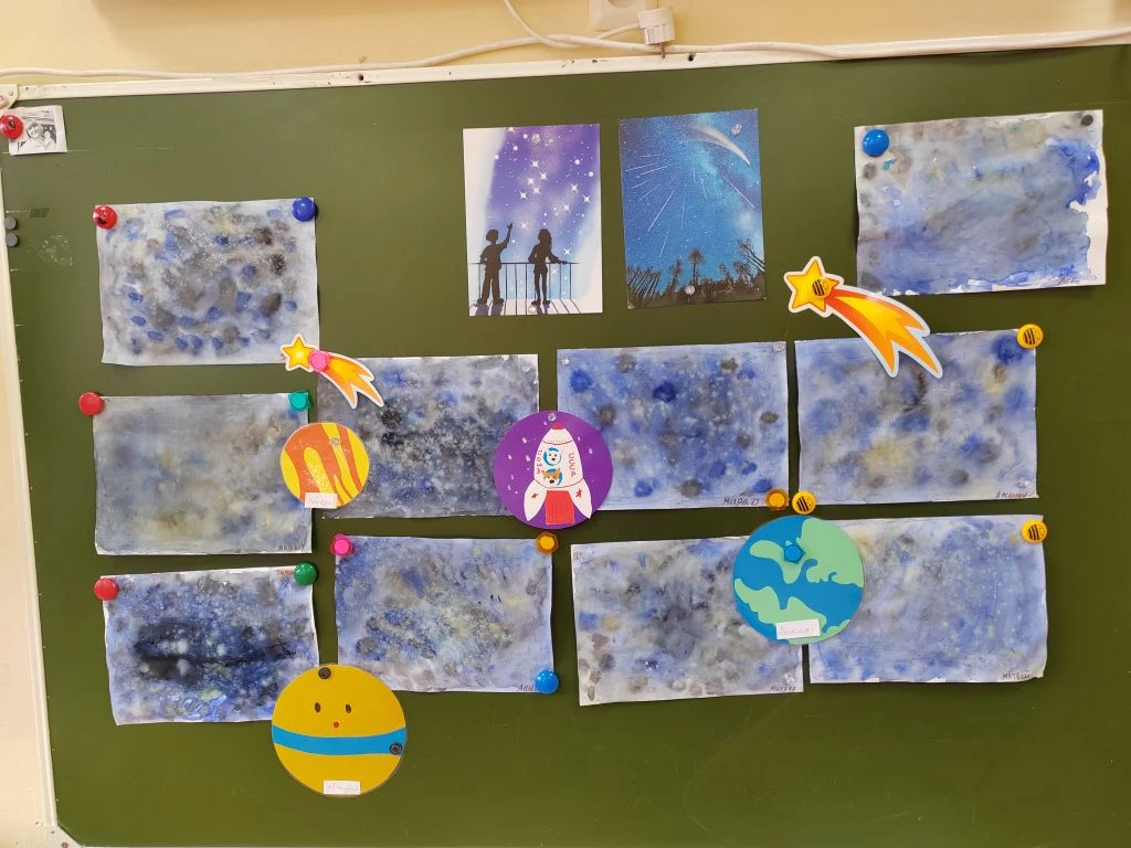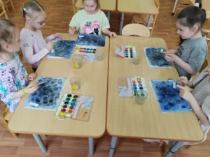 Цель: познакомить с нетрадиционными техниками рисования, закрепить знания о космосе, развивать цветовосприятие и чувство композиции.